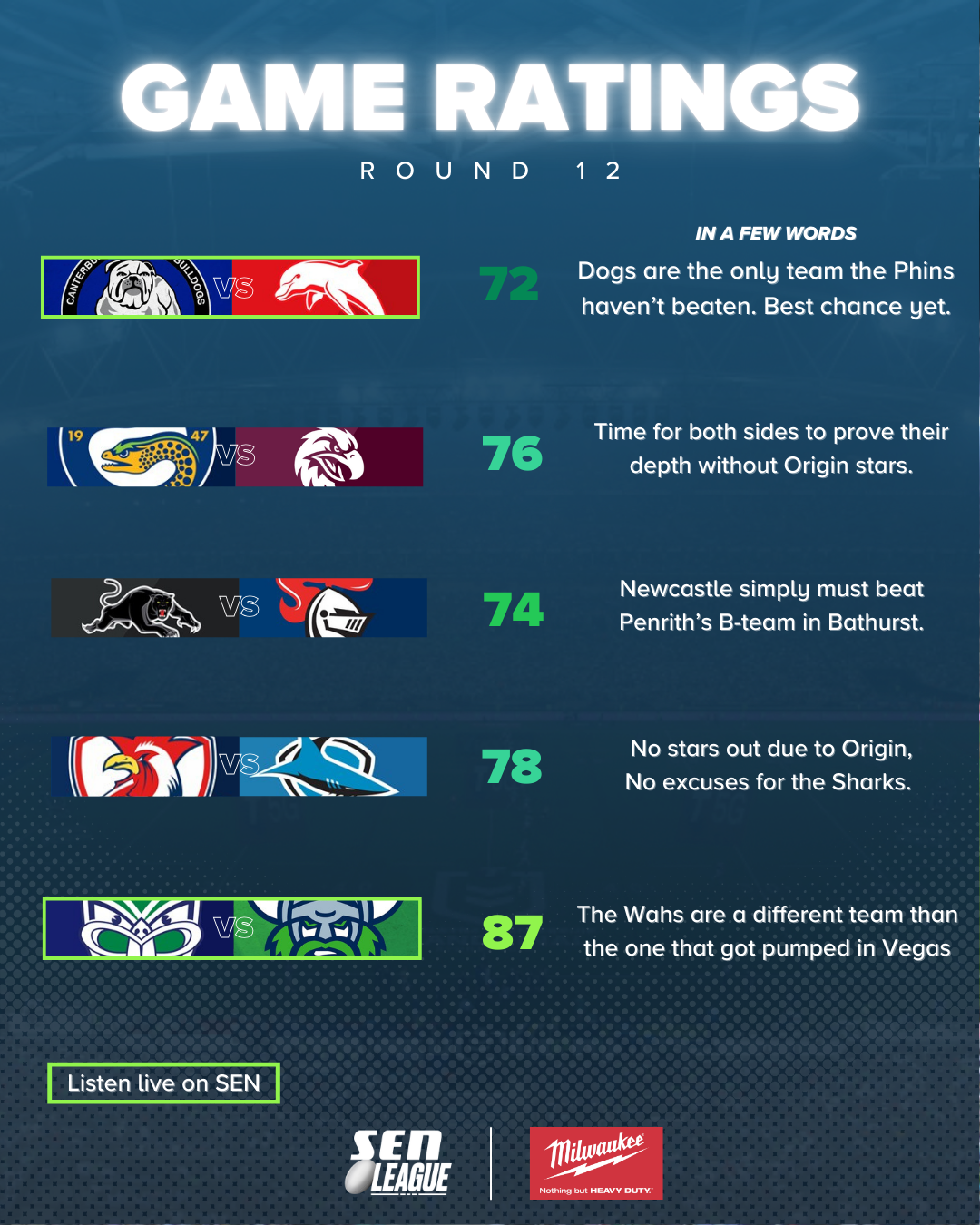 Each week, the SEN League team goes through the slate of games across the NRL and rates each game out of 100. The higher the number, the better the game.