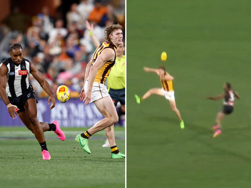 Weddle appeared to pull out of the contest as Quaynor never got close to making contact with the Hawk and after the drop, the Magpie began a handball chain that led to a Brody Mihocek goal, pushing the lead out to 64-27.