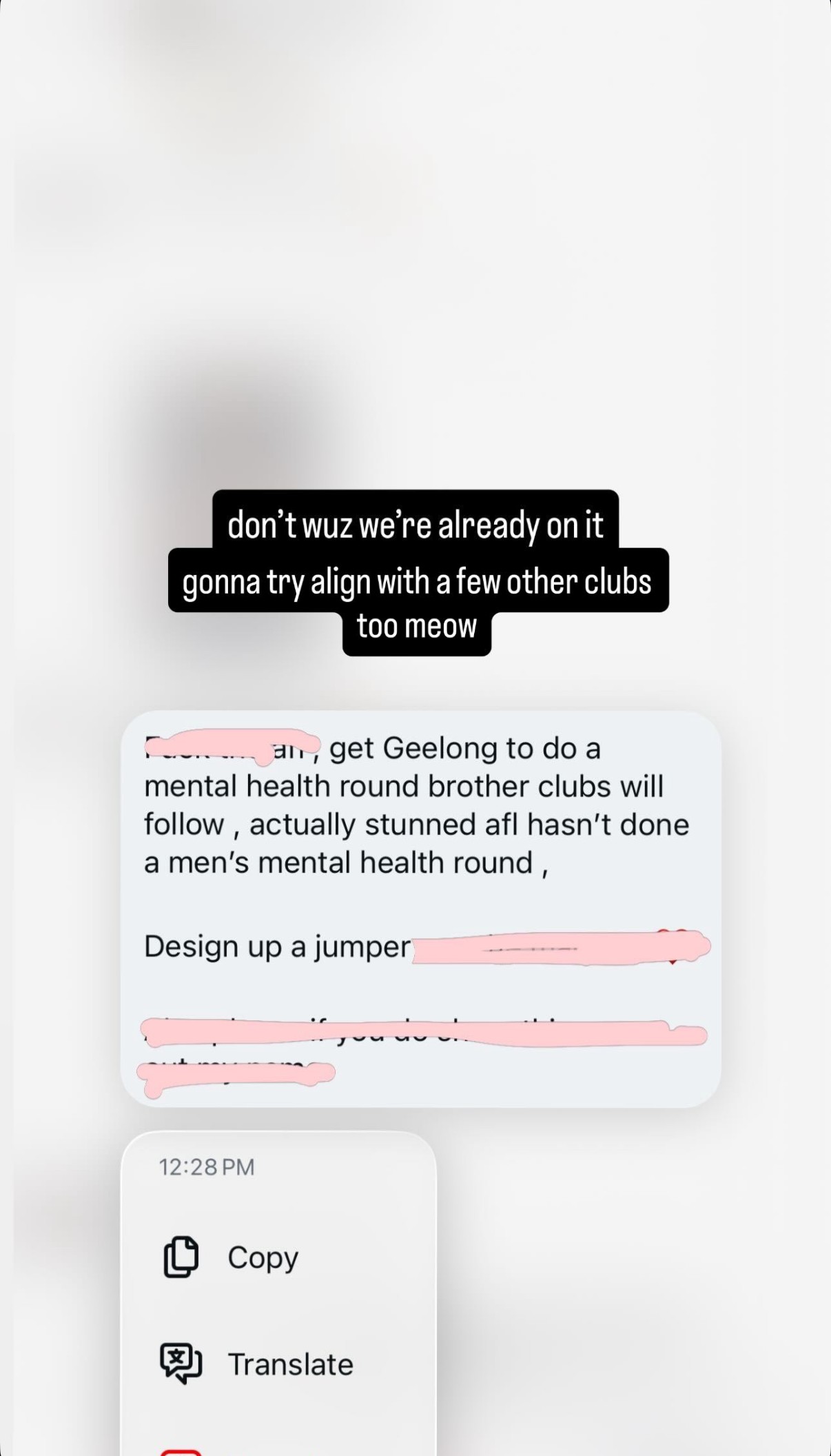 Smith posted once more, responding to a message stating that he and the Geelong Football Club are looking into combining with neighbouring teams to organise their own mental health dedicated round.