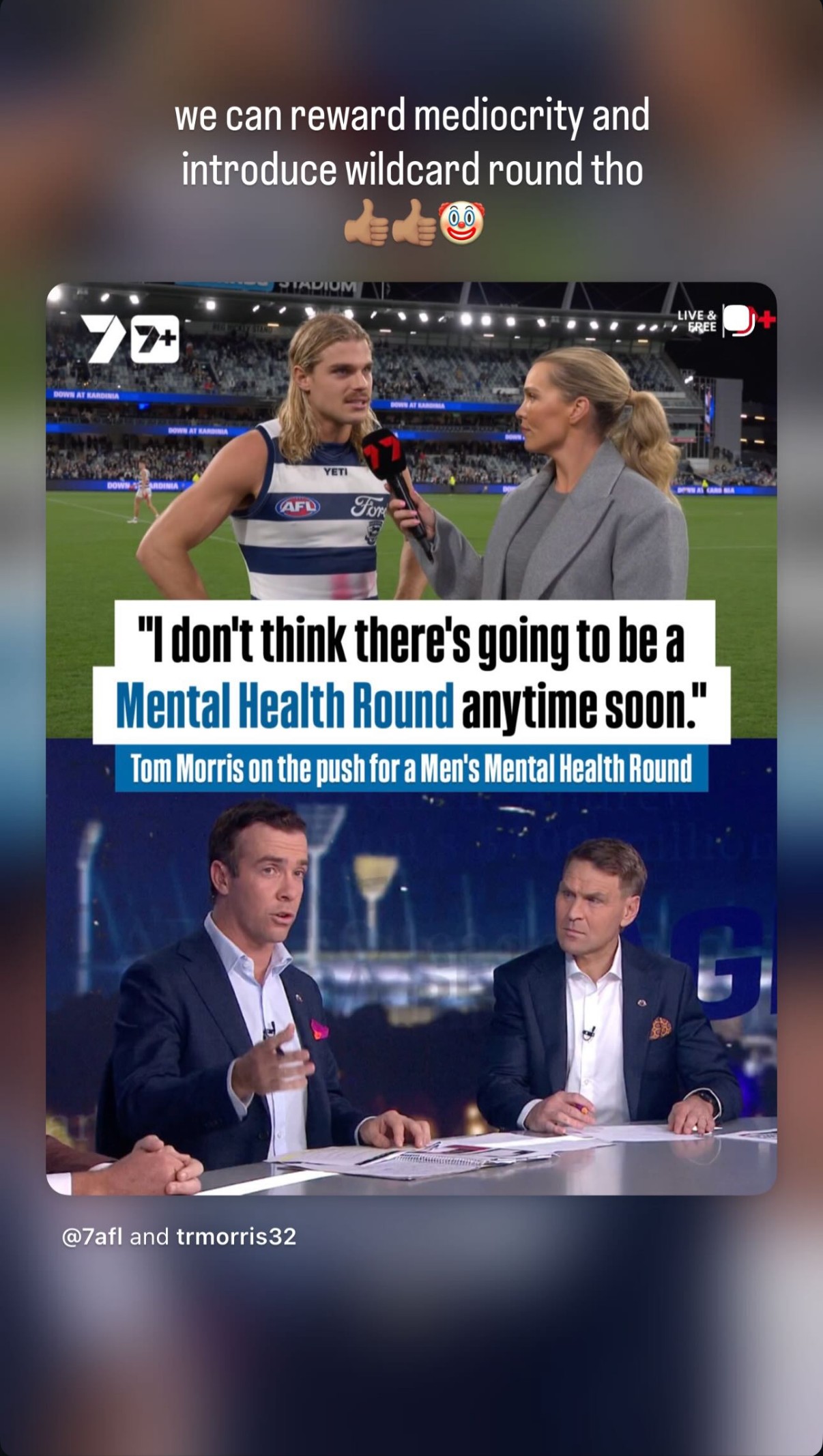 "The AFL hears that, but I don't think there's going to be a Mental Health Round anytime soon," Morris told Seven's The Agenda Setters.